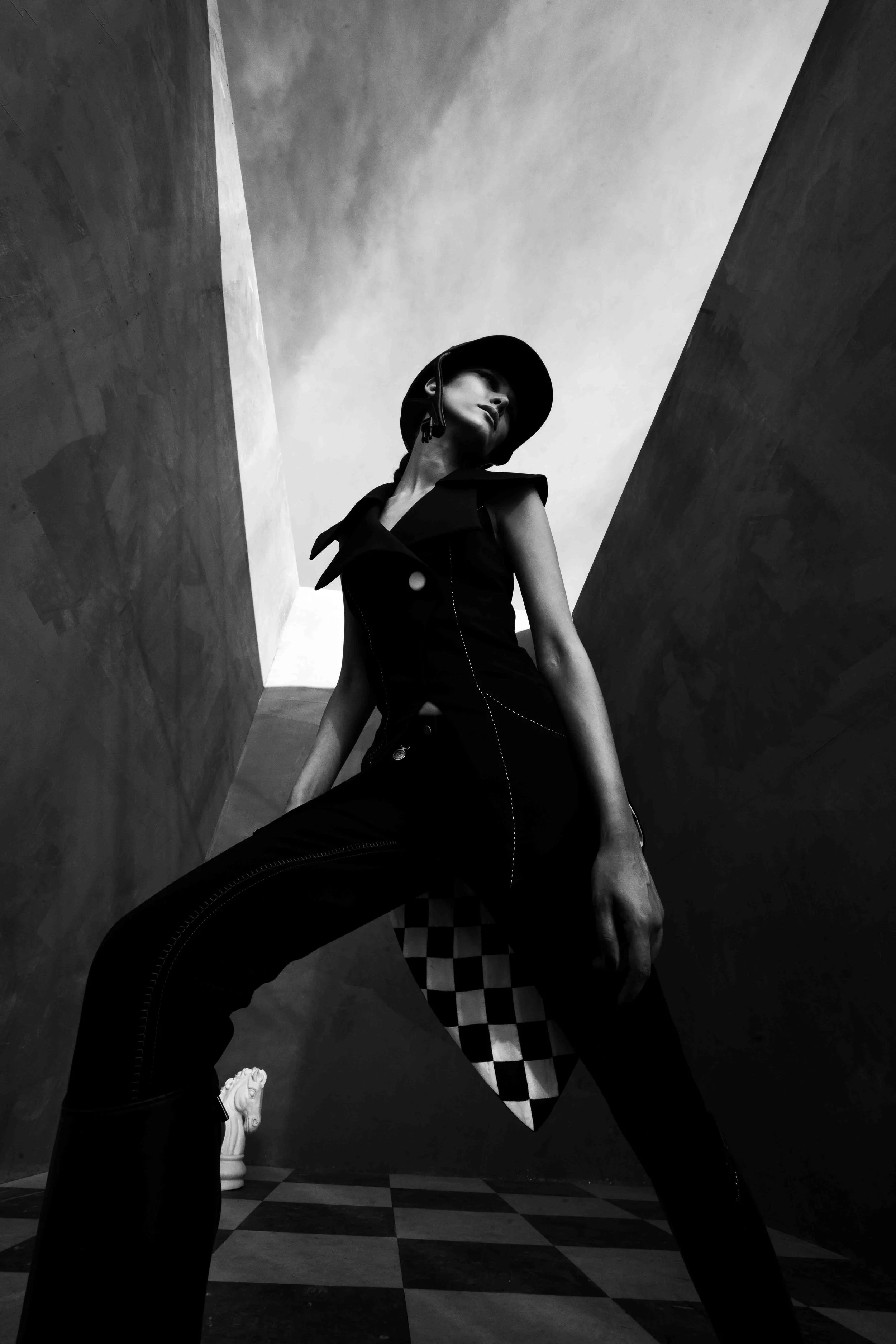 This project was made for women's wear brand named "Dabur" designed by Camila. The concept of chess board was built to represent the conflict between good and bad. Lightness and darkness in this project was showcased using make-up leveller and color scheme of the collection. The monochrome location of this project was held by a closed structure, which was decorated with checkered floor and chess pieces, including a live black horse to pledge on the concept.